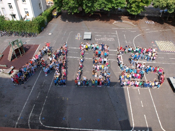 Der Schuleltern Beirat überreichte aus diesem Grund Herrn Rill ein Abschiedsgeschenk der besonderen Art. Mit den Schülern der Grundschule wurden die Intitialien der Schule auf den Schulhof nachgestellt, fotografiert und dann als grosses Plakat gedruckt.